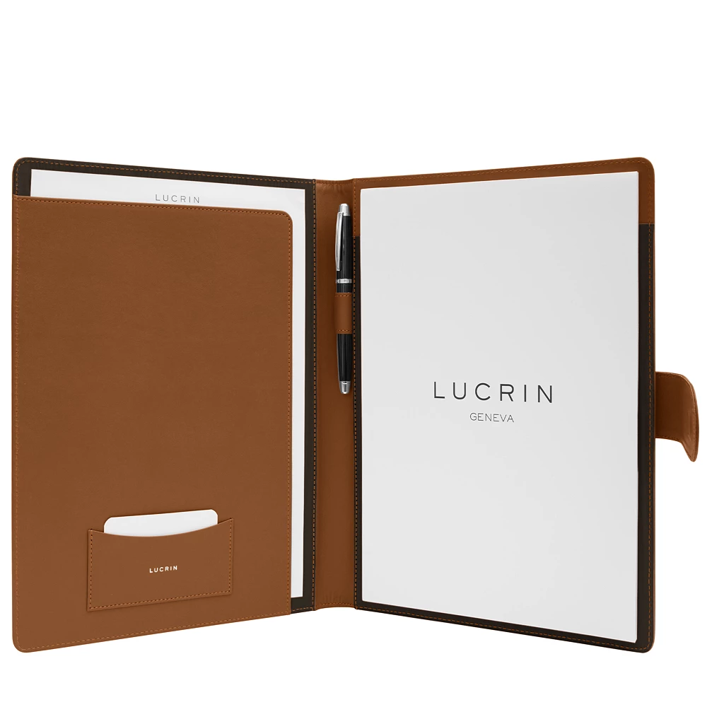 Conference Folder, A4 format with a loop closure, made in full grain leather. Inside left: - one large pocket for papers (18 x 22.5 cm), - 2 pockets for credit and/or business cards (9 x 6.5 cm), - on pen holder in the middle, - one compartment for note pad A4 format.