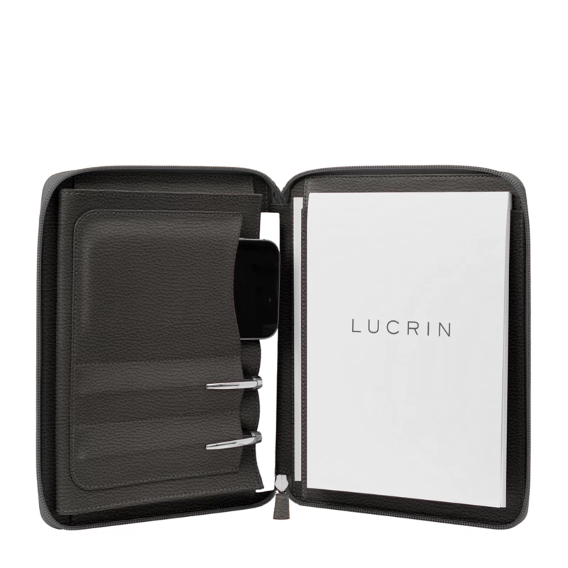 This premium organiser portfolio in A5 by LUCRIN Geneva is the perfect on-the-go tool for your professional and casual use. Its sleek design and multiple functional pockets make it a must-have for all business professionals. The leather portfolio features an 8.3-inch tablet pocket to carry your tablet as well as two pen slots and a zipper closure that keeps all your essentials securely in one place for you to travel with ease. Moreover, keep your smartphone and a notepad close at hand for any time you might need them. This premium leather construction is durable enough to withstand everyday wear and tear while you are on the move. Customise the leather type, colour and stitchings of this A5 Organiser Portfolio and monogram your initials or name for more elegance!