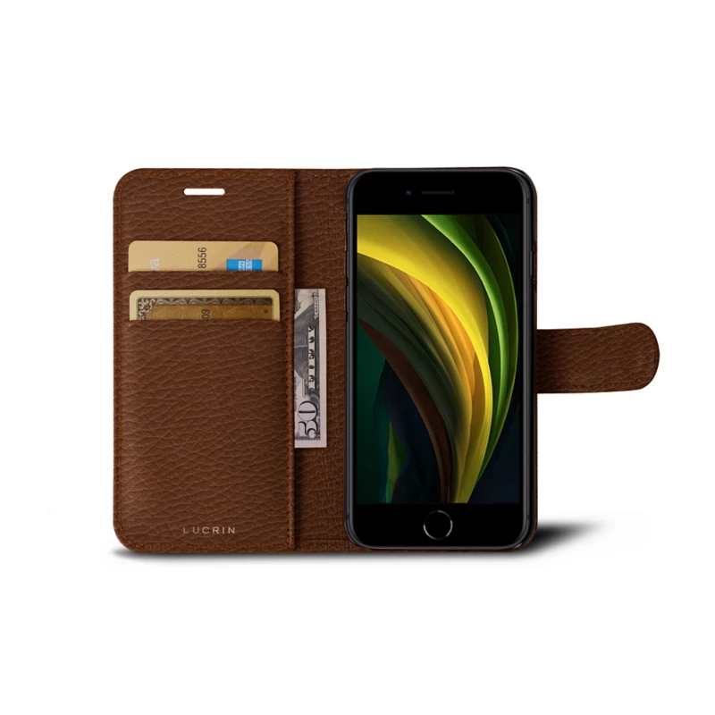 This is the timeless luxury wallet case for iPhone SE. Elaborated with exceptional precision, this iPhone SE wallet case is the perfect all-in-one, especially when you are on the move. You can fit 2 credit cards and a few folded bills in this genuine all-leather wallet thanks to the slots and flat pocket inside. As for your iPhone, it is perfectly safe in its dedicated place on the right-hand side of the leather case. A closure with a magnetic tab adds a touch of elegance & security to this leather iPhone wallet. All cable ports, the speaker and the camera are perfectly accessible without you needing to remove the phone from its case. Of course, you can personalise the iPhone SE wallet for a unique gift idea.