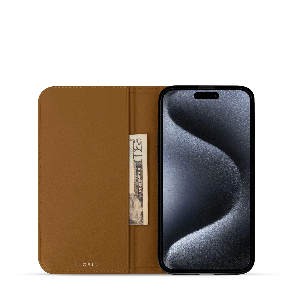 Designed for those looking for a slim and chic folio case for their iPhone 15 Pro, discover this minimalist wallet by LUCRIN Geneva. This minimalist wallet for iPhone 15 Pro comes with a lateral pocket for your bills and notes. You can easily pop your phone in and out the silicone bumper, which provides 360-degree protection to your smartphone, thanks to the raised edges along the screen and camera. This folio case for iPhone 15 Pro allows you to continue your conversation on the phone even with the magnetic flap closed. This case is designed to be QI wireless charging compatible, allowing you to charge your device without the need to remove it from the case. Add a personal touch to your minimalist wallet case by customising the leather colour and type. Engrave your initials to stand out from the crowd.