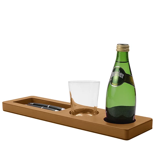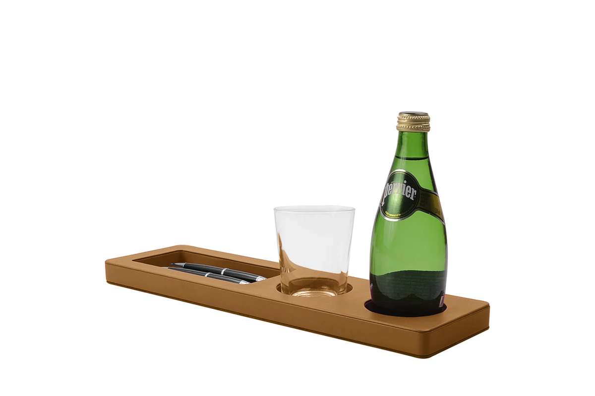 A wooden home office desk organiser covered in natural leather, perfect to keep your bottle, glass and accessories such as pens, paper clips, among others. Place this beautiful desk tidy tray on your table, and your workspace will look great - better organised and more elegant. There are 2 round slots (diameter 7.5 cm & depth 1.5 cm) where you can place a small bottle and your glass. There is also another rectangular space (17 x 7.5 x 1.5 cm) that acts as a storage space for pens, paperclips, pencils and all the small accessories you use regularly. This beautiful leather desk organiser can be personalised in the colour and leather that suit the decor.