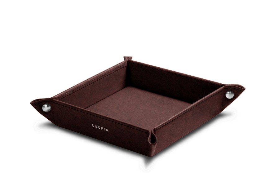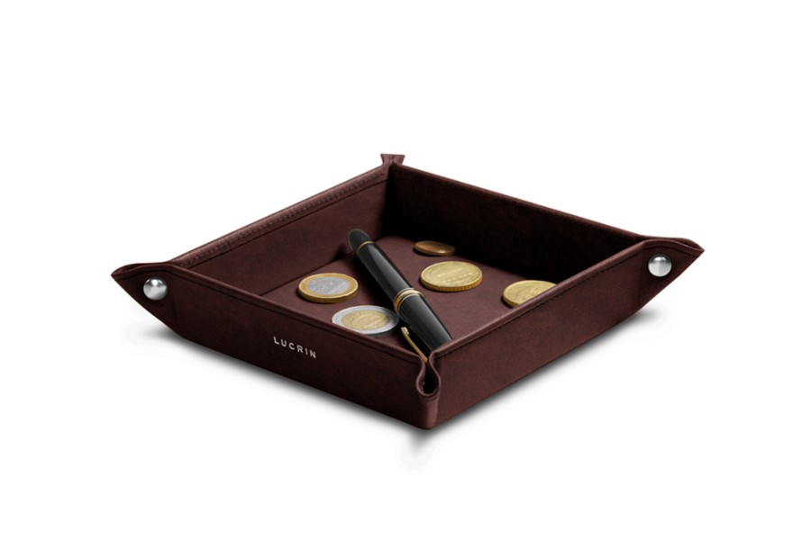 This is the small solid catchall from the Lucrin collection. Made entirely of natural leather, its flawless finishing touches make this a decorative object that is refined, yet highly practical. This square catchall can be placed anywhere in the home or office to organize and keep track of the items you keep in your pockets. The corners are held together with 4 metallic rivets.