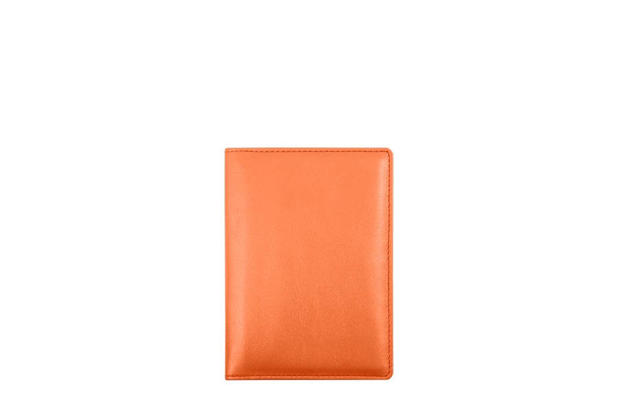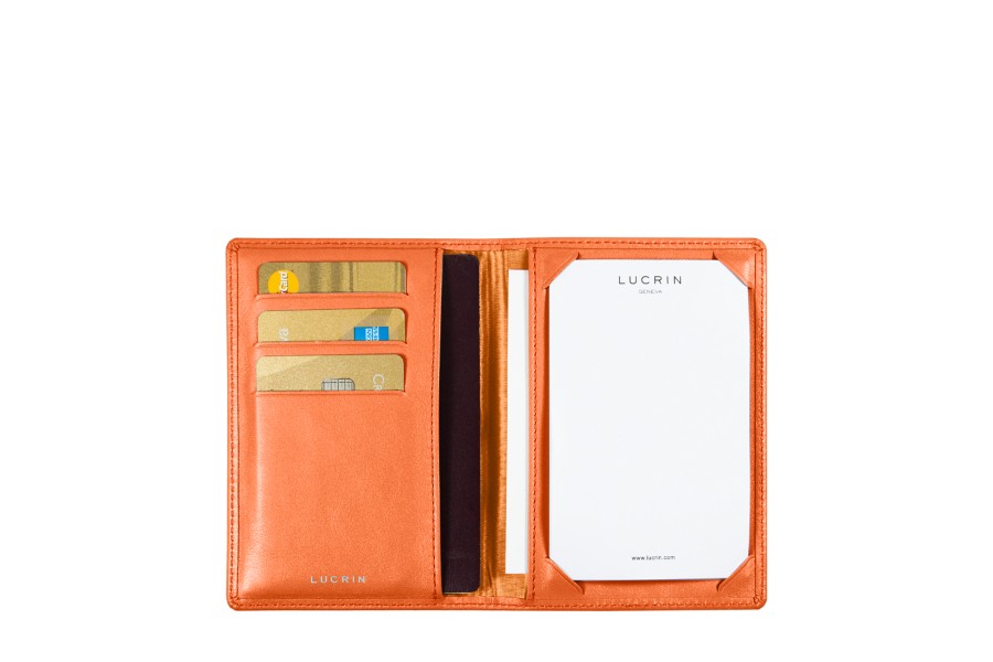 Pocket-sized note pad in full grain leather. Inside 2 pockets on the left, one for business cards and one large vertical passport format. On the right side, note pad and one large vertical pocket. Delivered with 10 white pages. Size open: 19,5 x 14 cm. Size closed: 9,5 x 14 cm